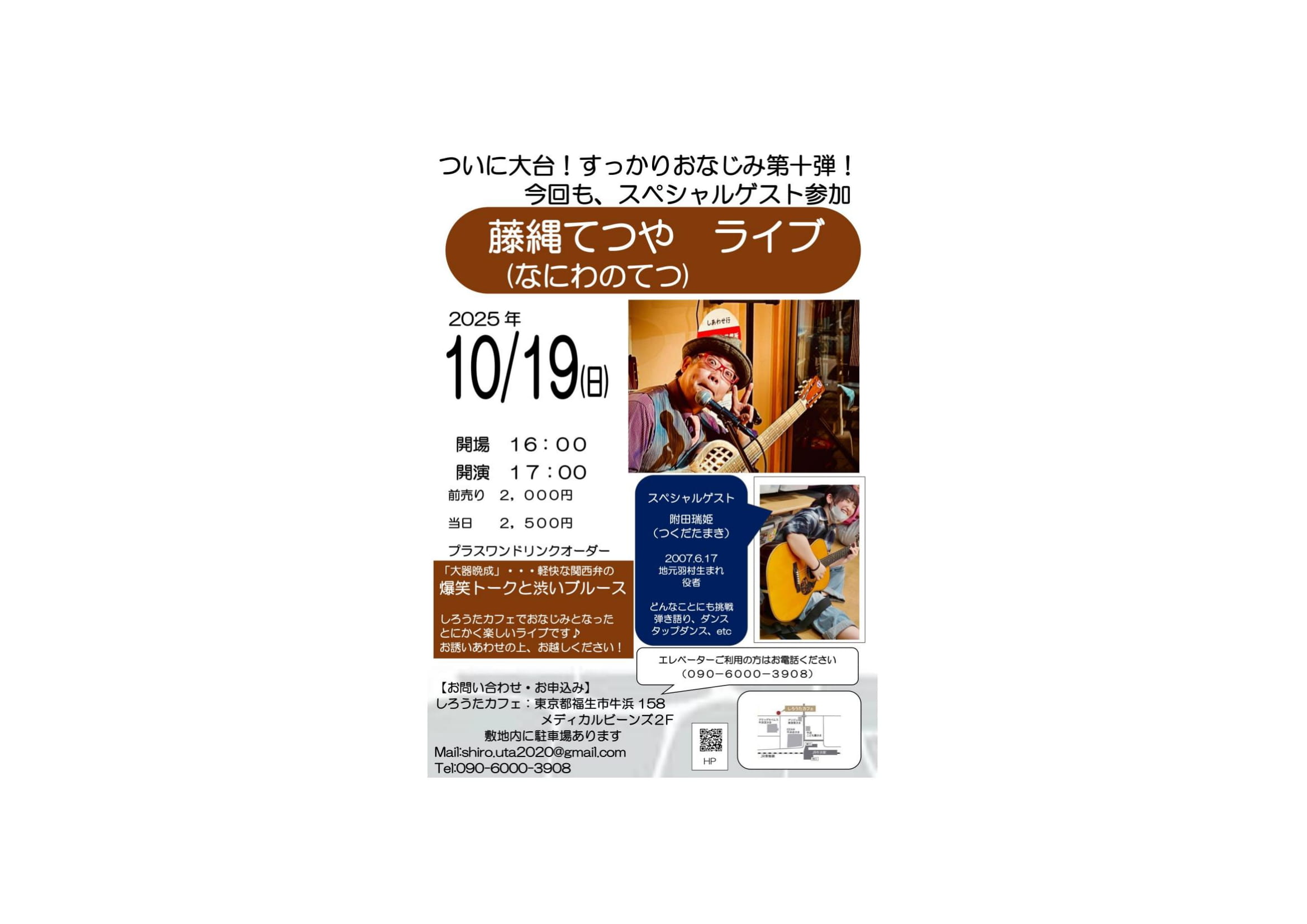 すっかりお馴染みになった藤縄てつや(なにわのてつ)さん、しろうたカフェでの夏のライブです。渋いブルースと、古い昭和歌謡、巧みなギターと爆笑MC。