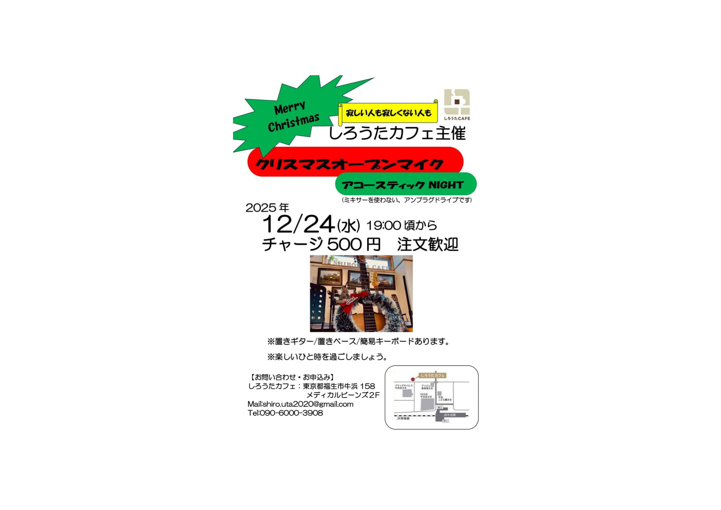 2025年12月24日(水)クリスマス「オープンマイク~アコースティックNIGHT」【ビギナーズ大歓迎】 2025 12/22 音楽ライブ 2025年12月3日2025年12月22日 今年もやるのか⁉ クリスマスの夜に、ほっこりアコースティックのオープンマイクを開催します。ビギナーの方も大歓迎‼集まったメンバーで楽しいクリスマスの夜を過ごしましょう。 音楽ライブ よかったらシェアしてね! URLをコピーしました! URLをコピーしました! 2025年12月21日(日)「ぽっかりオープンマイク」開催 2025年12月28日(日)城攻め‼男塾特別編忘年会 この記事を書いた人 shirouta 関連記事 2026年2月15日㈰谷村企画 ネイバーズ冠ライブ【田園にて】 2026年1月19日 2026年2月1日【しろうたカフェ4周年&中野督夫バースデー企画】 2026年1月14日 2026年1月25日㈰谷村企画【黄金のうたた寝】 2026年1月14日 2026年1月23日(金)総裁プロデュース【アンプラグド総裁フェス】 2026年1月14日 2026年1月18㈰藤縄てつや(なにわのてつ)ライブのお知らせ 2026年1月14日 2026年1月11日㈰Star☆Dustと【新年会】 2025年12月22日 2025年12月21日(日)「ぽっかりオープンマイク」開催 2025年12月3日 2025年12月14日(日) ビギナーズオープンマイク 2025年12月3日 コメント コメントする コメントをキャンセルコメント ※ 名前 ※ メール ※ サイト 次回のコメントで使用するためブラウザーに自分の名前、メールアドレス、サイトを保存する。