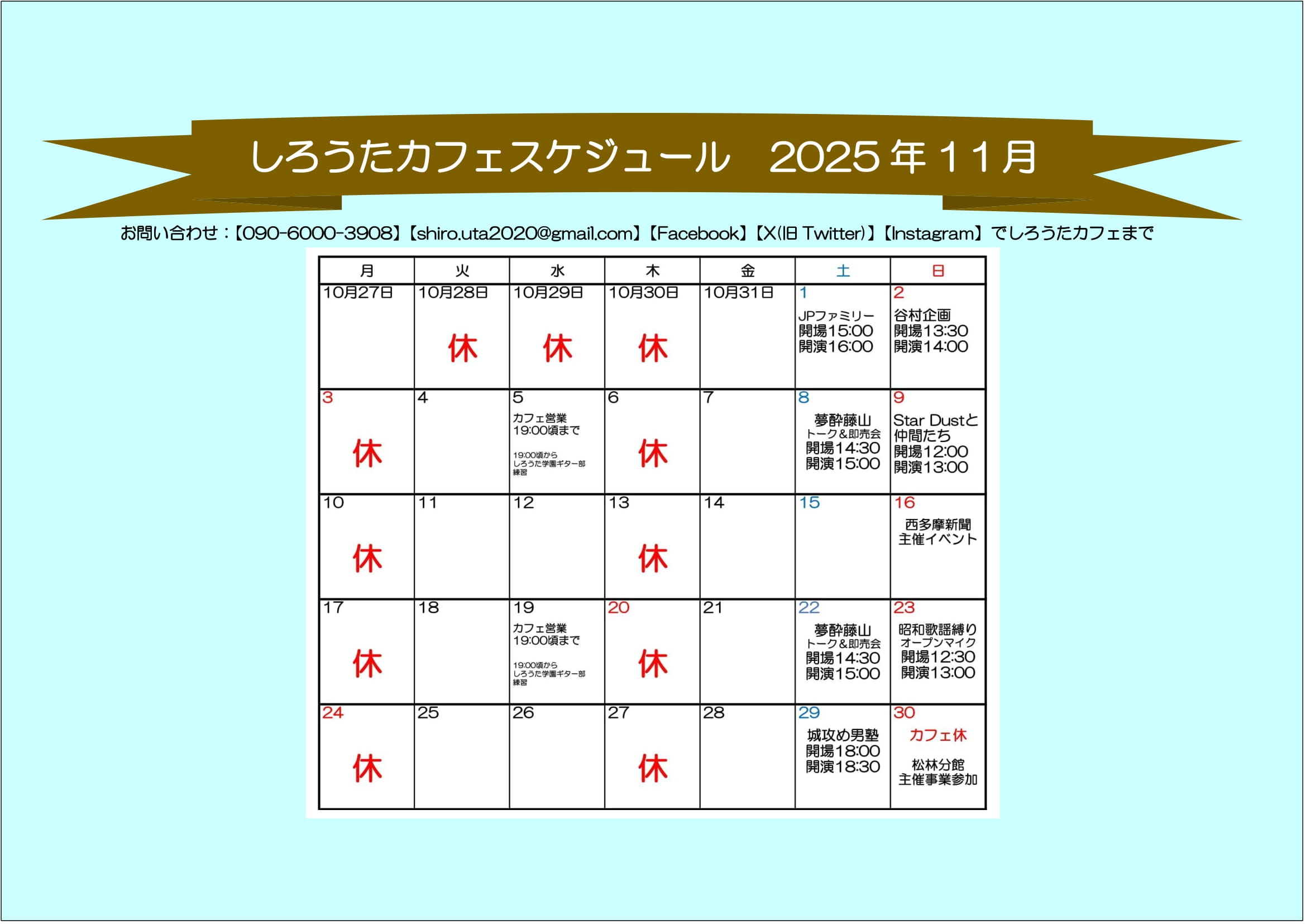 2025年11月のスケジュールです 2025 10/26 カレンダー 2025年10月26日 電話、メール、Facebook、X(旧Twitter)、Instagram等から、お気軽にお問合せ下さいね。 今後の予定もご確認いただき、今後の企画持ち込みの際にもご活用ください。 カレンダー よかったらシェアしてね! URLをコピーしました! URLをコピーしました! 2025年10月5日㈰ Star☆Dust企画「秋の妖精たちはやってきたのか?」 この記事を書いた人 shirouta 関連記事 2025年10月のスケジュールです 2025年10月4日 2025年9月のスケジュールです 2025年9月13日 2025年8月のスケジュールです 2025年7月31日 しろうたカフェ2025年7月のスケジュールです。 2025年7月6日 しろうたカフェ2025年7月のスケジュールです。 2025年7月4日 しろうたカフェ2025年6月のスケジュール&今後の予定です。(一部修正) 2025年6月11日 しろうたカフェ2025年5月のスケジュール&今後の予定です。 2025年5月3日 しろうたカフェ2025年4月のスケジュール&今後の予定です。 2025年4月2日 コメント コメントする コメントをキャンセルコメント ※ 名前 ※ メール ※ サイト 次回のコメントで使用するためブラウザーに自分の名前、メールアドレス、サイトを保存する。